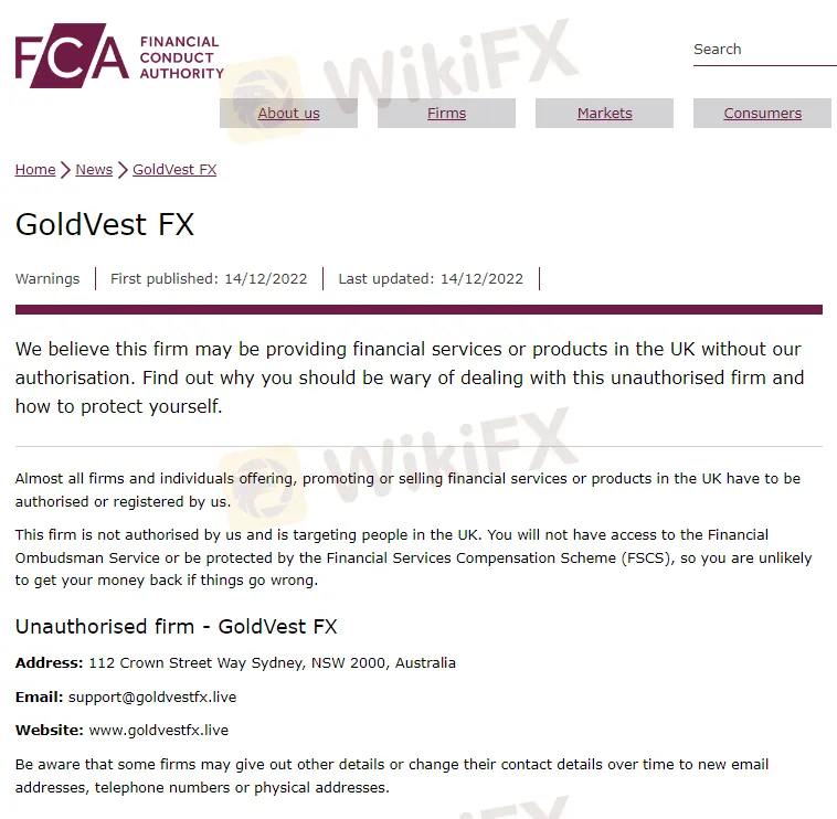 FCA警告稱:GoldVest FX 在未經我們授權的情況下在英國提供金融服務或產品,如果一旦遭受資金損失,您將無法使用金融申訴專員服務或受到金融服務補償計劃 (FSCS) 的保護。