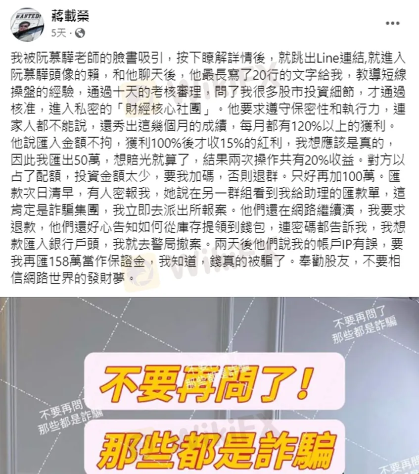 據了解,蔣載榮是在臉書注意到自稱是「財經專家阮慕華」的廣告,因此被吸引點了連結,隨後加了一位有阮慕驊大頭貼的LINE,對方不但詢問許多投資細節、分享短線操盤的經驗,還經過10天的考核審理,才同意他加入私密的「財經核心社團,如此煞有其事的過程,讓蔣載榮逐漸卸下心防。