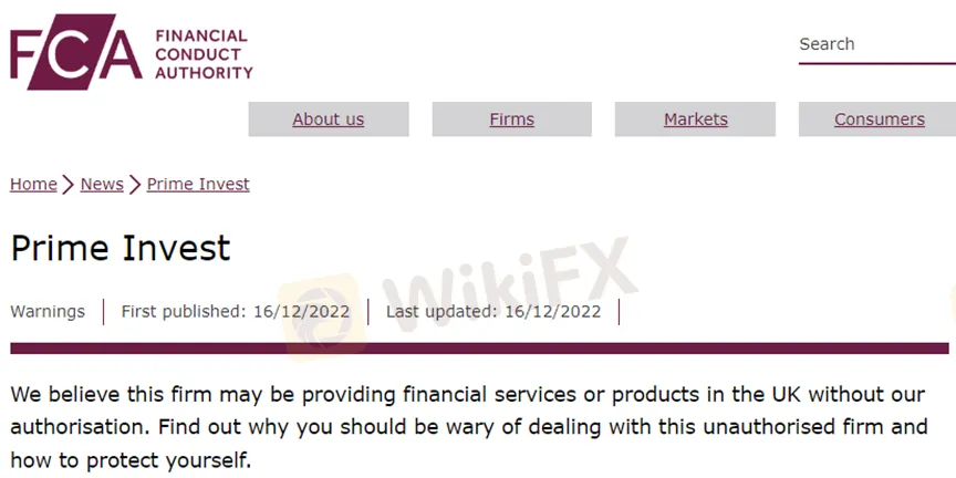 近日,英國金融行為監管局(FCA)提醒投資者注意,名為Prime Invest的實體進行了需經FCA授權的業務活動,但從未獲得FCA授權或在FCA註冊,在沒有FCA監管的情況下運營業務。