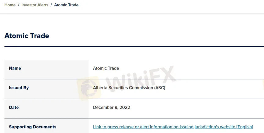 ATOMIC TRADE沒有(也從未)在阿爾伯達省註冊從事證券交易業務或就投資、購買或出售證券向任何人提供建議。因此ASC敦促阿爾伯達省居民,在與未經認可或註冊的公司打交道時謹慎行事。