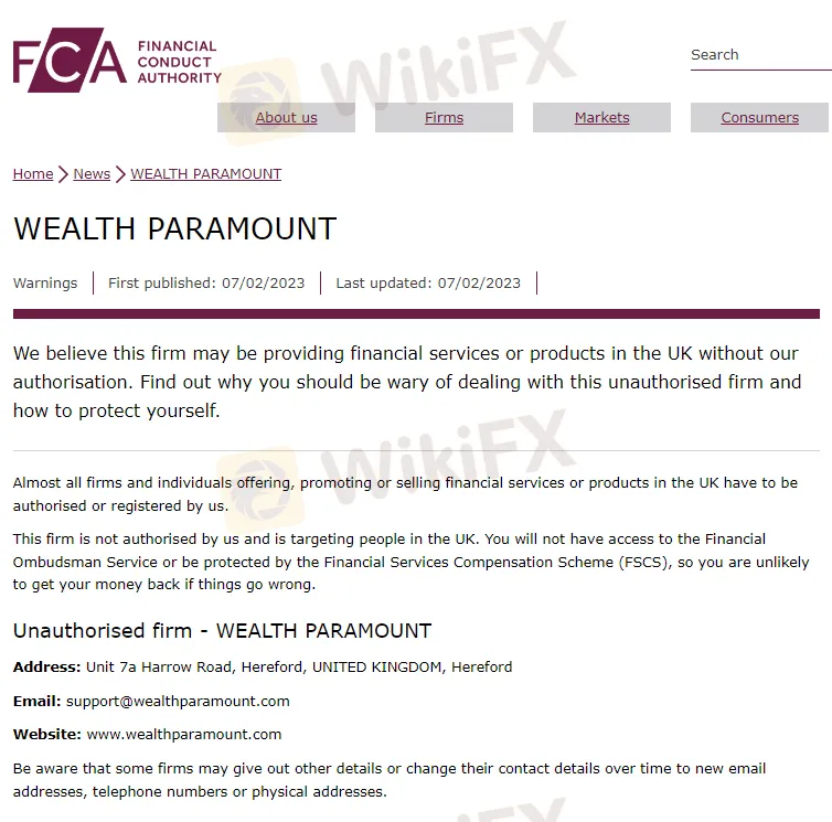 根據外匯天眼監測,2月7日,英國金融行為監管局( FCA )對 WEALTH PARAMOUNT 發出警告,提示投資者警惕與這家未經授權的公司打交道。