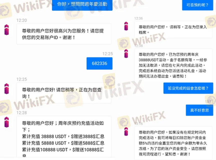 根據受害者的分享,他是在社交平台IG上認識了一位網友,並且因為對方的推薦到MT5 Online trading註冊。一開始入金情況還算正常,並靠著跟單操作小賺一筆。之後他又被網友鼓吹參加平台的週年慶活動,預約了儲值38888USDT領匯息3888USDT。