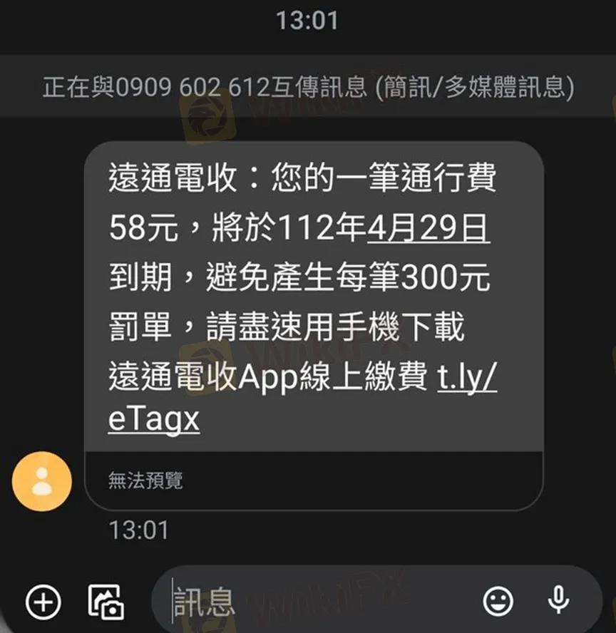 據了解,受害者是在與同事吃飯時收到一則遠通電收的催繳簡訊,通知他有一筆58元的通行費將在4/29到期,如果逾期將收到300元罰單。當時受害者因忙碌而沒有多想,只想趕快把事情解決掉,因此點入了簡訊裡提供的網址下載APP。