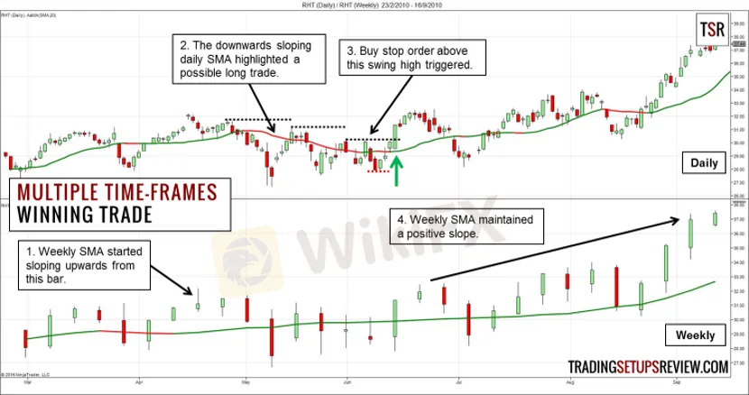 1:周線均線向上,在日線週期尋找回檔做多信號。