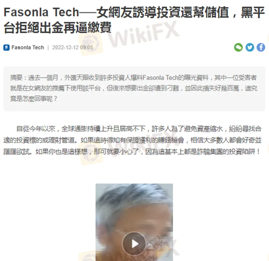 據了解,受害者是在去年11月透過LINE認識一位網友,並被對方介紹使用Fasonla Tech,進行有關黃金與石油的投資。之後平台以網站升級與更新等理由,引導他傳去使用Ridge Corporation這個外匯券商。