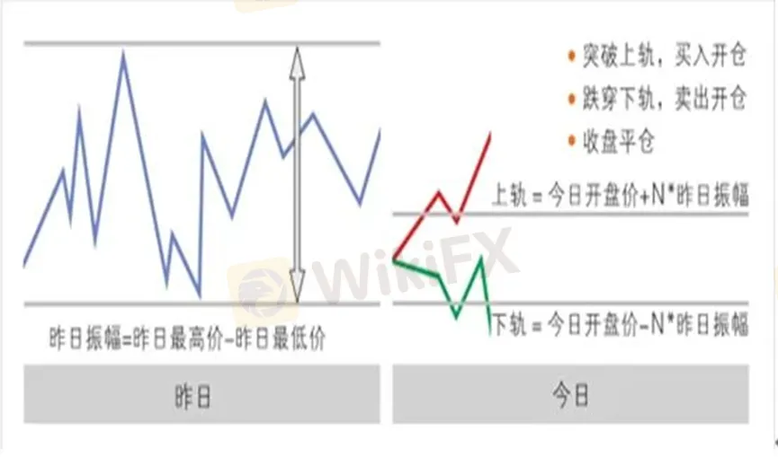 RangeBreak區間突破交易系統不去預測未來的市場行情是震盪亦或大單邊走勢,它認為只要今日價格從開盤價向上或向下突破了昨日震盪的N倍,那麼,價格本身就會發出大單邊行情的預警,投資者只要跟隨市場傳遞的資訊順勢入場操作即可。