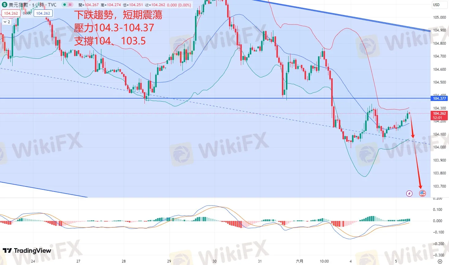 #美元指數 日圖下跌趨勢,建議繼續逢高做空為主。短期建議關注反彈壓力區104.3-104.37區域,壓力區配合承壓信號逢高做空。
