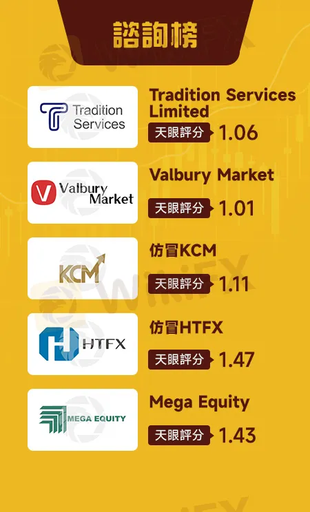 端午連假過後,由於美元強勢表態,亞洲貨幣紛紛走貶,不少投資人出於避險的考量,紛紛開始將注意力放到外匯市場。為幫助廣大投資人避免受騙,外匯天眼整理過去2個月最多用戶諮詢與投訴的10家券商,請大家一定要小心這些高風險平台。首先公布被最多人諮詢的5家交易商:Tradition Services Limited、Valbury Market、仿冒KCM、仿冒HTFX、Mega Equity。