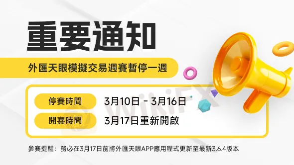 對於本次暫停比賽帶來的不便,我們深表歉意,感謝大家的理解與支持!3月17日,期待看到您的精采表現。如有任何疑問或需要幫助,歡迎隨時與外匯天眼客服聯繫!