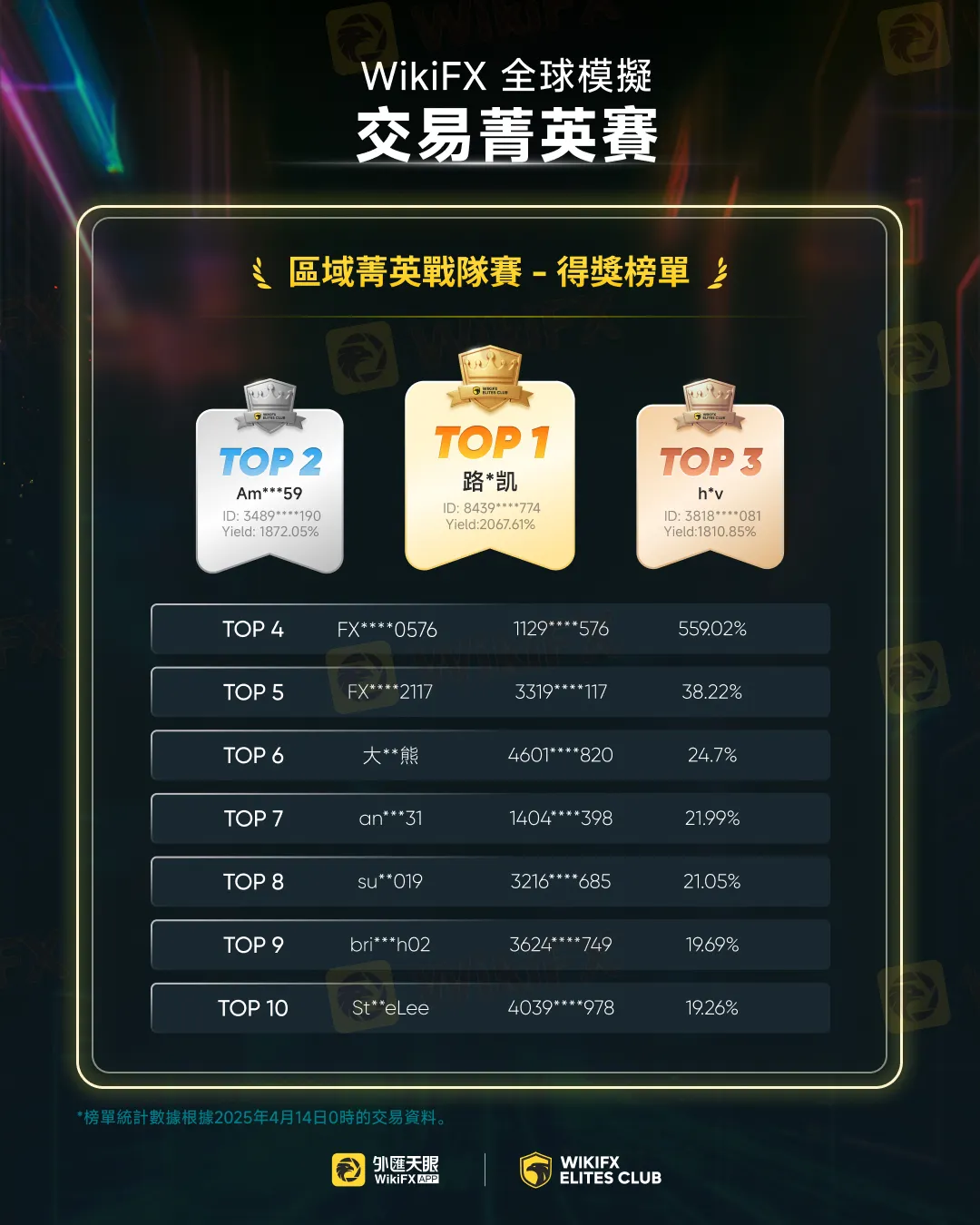 本次大賽的亮點之一是區域精英戰隊賽的激烈角逐。來自馬來西亞與臺灣的精英戰隊,在業界專家、重量級IB及知名KOL的領銜下,以專業策略與默契配合展開高端對決。最終,來自臺灣的潮錢看戰隊憑藉卓越表現榮登區域精英戰隊賽冠軍寶座,其精湛的交易理論與安全性原則為行業樹立了典範,其中MVP(最有價值交易者)由策略精准、風險控制能力突出的選手[吳老爹]摘得,其交易手法與理念成為投資者爭相學習的標杆。精英選拔賽方面,全球交易高手同台競技,TOP3選手[路*凱]、[Am***59]、[h*v]亦憑藉卓越實力脫穎而出,分別斬獲前三甲殊榮,其中TOP10選手更獲得WikiFX精英俱樂部成員資格,成為行業新晉精英力量。