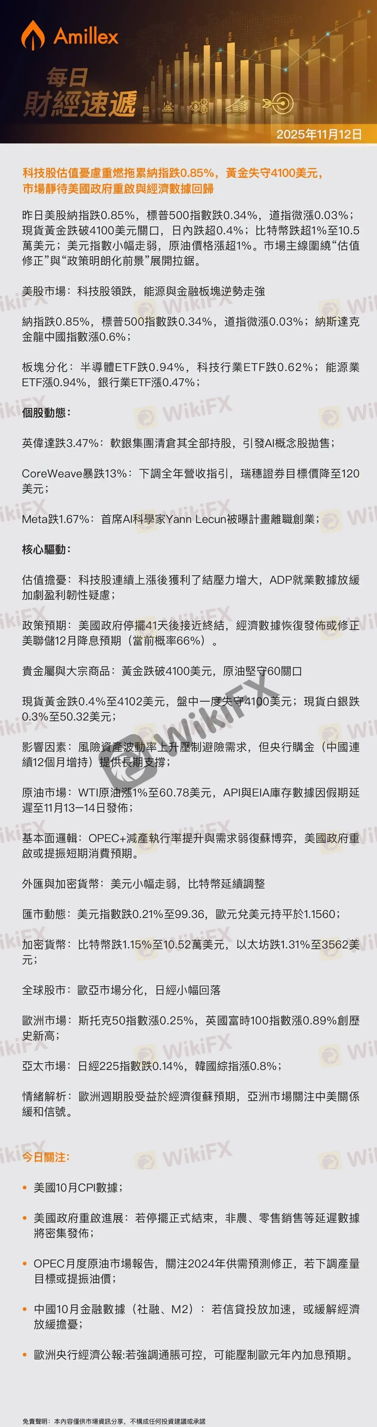 Amillex每日匯評:科技股估值憂慮重燃拖累納指跌0.85%,黃金失守4100美元,市場靜待美國政府重啟與經濟數據回歸