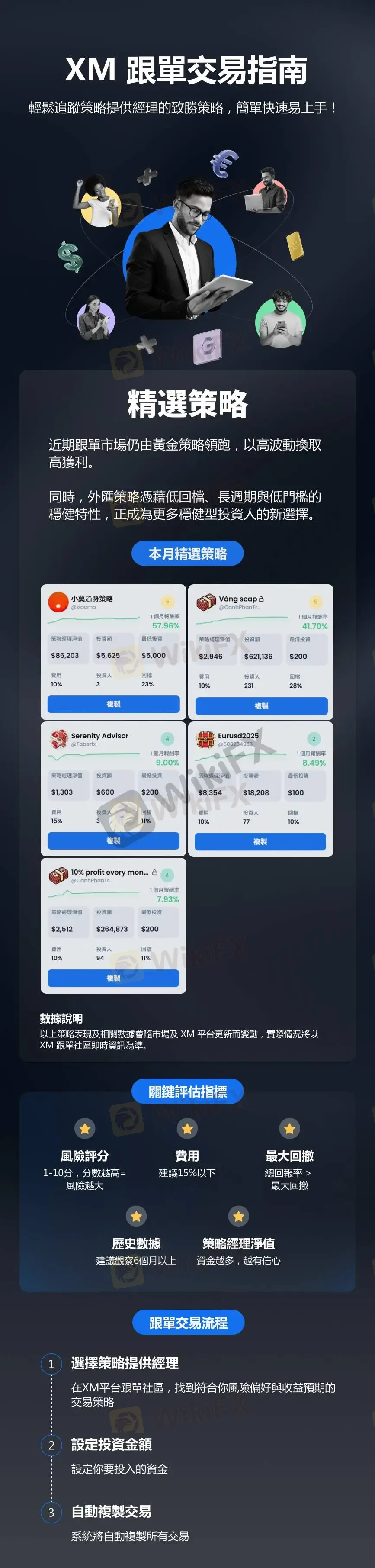 摘要:本月策略呈現出「黃金領跑、外匯崛起」的雙主線:黃金策略依然是高報酬焦點,頂尖策略經理單月獲利突破 50%;外匯策略則以相對穩健、門檻較低的特性,逐漸吸引投資人關注。在 XM 跟單社區 (Copy Trading) 中,你可以依照自身的風險偏好與交易風格,選擇合適的策略經理,系統會自動同步他們的交易操作——輕鬆跟單,掌握市場節奏!精選亮點:• 黃金策略月獲利突破 50%• 外匯策略獲利約 8%–9%