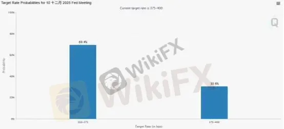 接著,市場對於美國12月美聯儲降息概率降至69.4%,認為美聯儲降息有疑慮的部分並非美國經濟體強韌。大多數投資人擔憂在沒有經濟資料作為參考的情況下,美聯儲可能採取按兵不動的概率較大。如果美聯儲在12月對利率決議採取按兵不動,就業市場若比起預期的更加疲軟,市場就更加擔憂未來進入通縮風險。