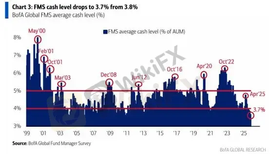 從11月FMS基金經理人報告也顯示,當前現金水位達到歷史低位水準,From 3.8% to 3.7%,展現基金經理人對於未來經濟增長環境的樂觀情緒。