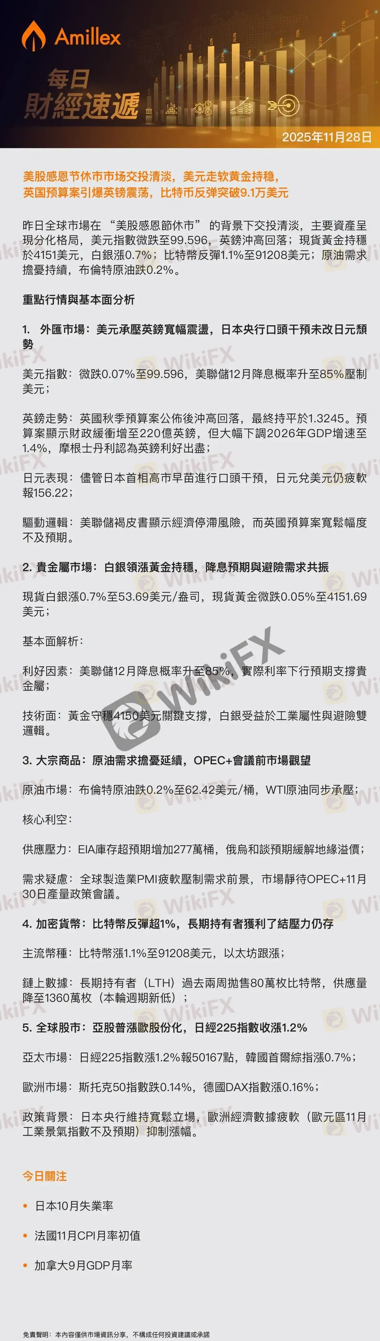 Amillex每日汇评:美股感恩节休市市场交投清淡,美元走软黄金持稳,英国预算案引爆英镑震荡,比特币反弹突破9.1万美元
