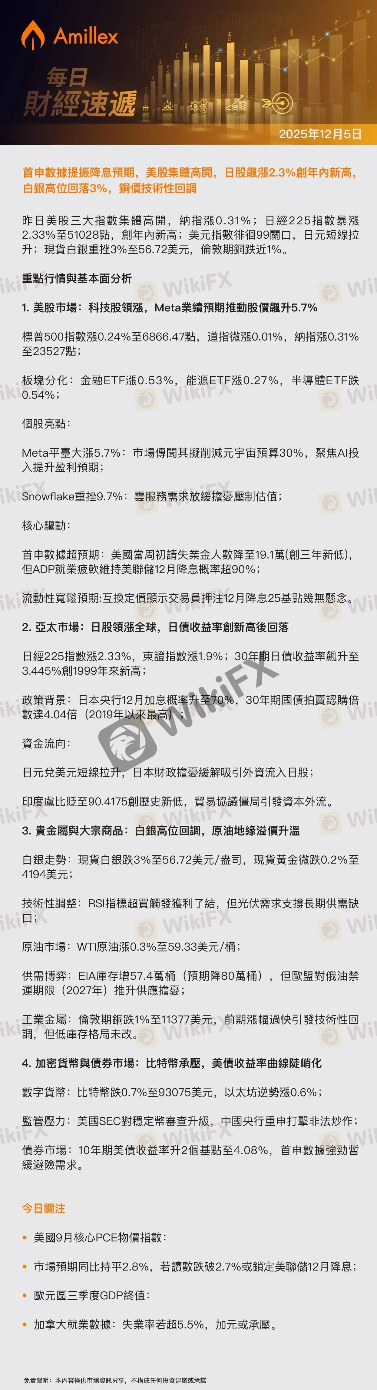 Amillex每日匯評:首申數據提振降息預期,美股集體高開,日股飆漲2.3%創年內新高,白銀高位回落3%,銅價技術性回調