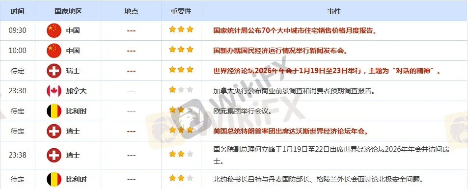 上週五,川普表示希望讓哈塞特繼續留任原職位,市場猜測哈塞特出任聯準會主席的機會降低,美元指數扭轉跌勢,最終收漲0.02%,報99.38點;基準的10年期美債收益率最終收報4.227%,對聯準會政策利率敏感的2年期美債收益率收報3.592%。在全球地緣政治緊張局勢持續發酵的背景下,美國總統川普上週六(1月17日)推出的關稅策略引發了國際市場的劇烈波動。這一策略旨在通過經濟壓力迫使歐洲國家就格陵蘭島控制權進行談判,導致現貨黃金價格週一開盤急劇上漲近100美元,再度刷新歷史高點,截止07:35,最高觸及4690美元/盎司。