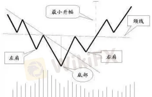和頭肩頂的形狀一樣,只是整個形態倒轉過來而已,又稱「倒轉頭肩式」。形成左肩時,價格下跌,成交量相對增加,接著為一次成交量較小的次級上升。接著價格又再下跌且跌破上次的最低點,成交量再次隨著下跌而增加,較左肩反彈階段時的交投為多──形成頭部;從頭部最低點回升時,成交量有可能增加。整個頭部的成交量來說,較左肩為多。