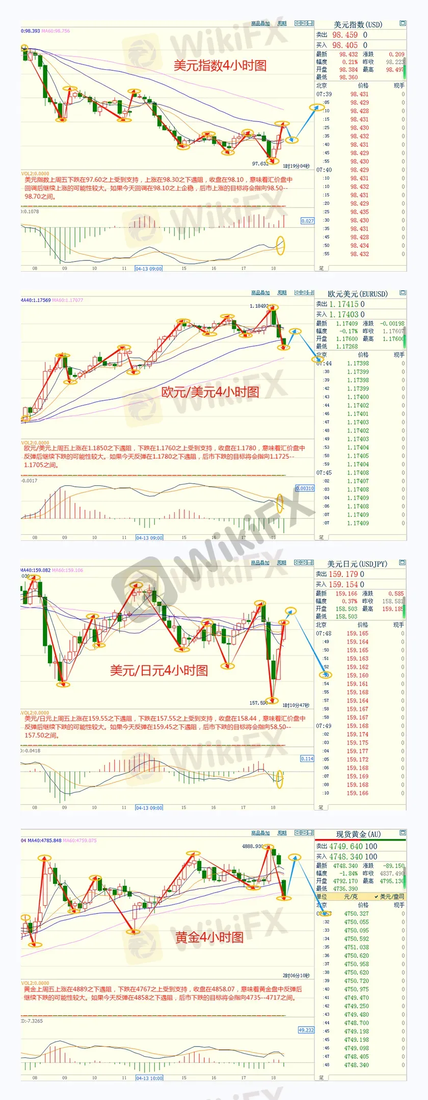 美元指數上週五下跌0.3%至97.96,盤中觸及七週低位97.632,連續第二週收跌。伊朗宣佈在停火期間對所有商船開放海峽,美伊談判取得進展,油價暴跌逾10%,美股大漲,美債收益率走低。